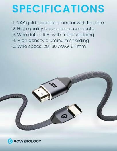 Powerology 8K HDMI Braided Cable, 2M, 24K Gold Plated Connectors, 10K Resolution, Dolby Atmos, eARC, Lightweight, Durable Aluminum-Alloy Shell for Top Performance, Gray | PWHDC2M-GY