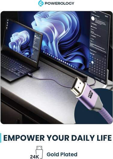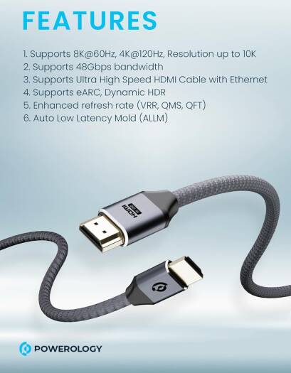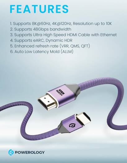 The Powerology 8K HDMI Braided Cable is the ultimate solution for enhancing your home entertainment setup. Designed for superior performance, this 3-meter cable supports up to 10K resolution, delivering stunning visuals that bring your favorite movies, games, and shows to life. Whether youre watching in 8K at 60Hz or 4K at 120Hz, the cable ensures smooth, sharp, and crystal-clear images that elevate your viewing experience. What sets this cable apart is the 24K gold-plated connectors, which are engineered for durability and longevity. These connectors resist rust and wear, ensuring you get consistent, high-quality performance even after repeated use. Whether youre plugging and unplugging devices or rearranging your setup, these connectors are built to withstand it all. The braided design adds not just style but also exceptional durability. This fabric-braided exterior prevents tangling and fraying, making the cable resistant to everyday wear and tear. Alongside this, the Aluminum-Alloy shell provides an extra layer of protection, making the cable resistant to damage from drops and pressure, so you can rely on it for long-term use. Audio quality is just as impressive as the visuals, thanks to support for Dolby Atmos and eARC. This means youll enjoy rich, immersive sound that complements the stunning picture quality, perfect for a fully cinematic experience at home. Despite its robust build, the Powerology 8K HDMI Braided Cable remains lightweight and portable. At 3 meters l