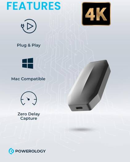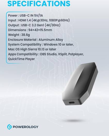 Powerology Capture Card 1C 3.2 Gen1 Input: 1HDMI 1.4, support 4K/30Hz Enhance your streaming and gaming experience with the Powerology UHD Video 4K Capture Card, a high-definition capture device designed for professional-level performance. This capture card supports 4K at 30Hz and 1080p at 60Hz, offering zero latency for real-time action. Equipped with HDMI 1.4 and USB-C 3.2 Gen1 inputs, it ensures smooth and reliable video transfer, making it ideal for live streaming, recording, and gaming on platforms like OBS Studio and XSplit. Perfect for gamers, content creators, and live streamers, this external capture card is compatible with both Windows 10 and Mac OS High Sierra 10.13 or later. It supports multi-device connections, including PC, laptop, console, and more. The aluminum alloy enclosure provides durability, while the plug-and-play functionality makes setup a breeze. Whether you’re using it for gaming, this low latency capture card ensures a seamless and professional broadcast. Key Features: 4K/30Hz and 1080p/60Hz support for high-quality streaming Zero Delay Capture for real-time action Multi-device compatibility: PC, console, and more OBS, XSplit, Potplayer, and QuickTime Player compatible Upgrade your setup with the best capture card for gaming and streaming, featuring high-definition input, loop out options, and multi-device support for a versatile and efficient broadcast solution.
