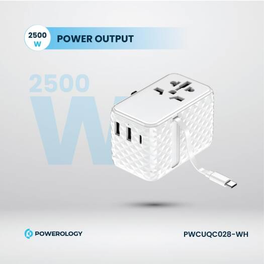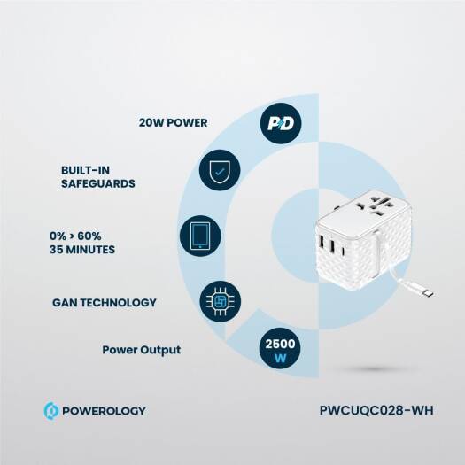 Introducing the Powerology GaN Technology 20W PD Universal Adapter, your ultimate charging solution for all your devices. This compact and efficient adapter features a retractable Type-C cable, making it perfect for travel and on-the-go use. With its advanced GaN technology, this adapter delivers high performance while remaining energy-efficient, allowing you to charge devices quickly and safely. Experience rapid charging with the ability to power your devices from 0% to 60% in just 30 minutes. The 20W total output ensures that you can charge multiple devices simultaneously without compromising speed. This adapter offers a multi-port output, providing USB-C output at 5V/3A (15W), as well as USB A1 and A2 outputs at 5V/2.4A (12W), making it compatible with a wide range of gadgets. Designed for global travelers, the Powerology adapter is compatible in over 150 countries, giving you peace of mind wherever you go. With an input range of 100-250V AC and a robust power output of 2500W, this adapter is built to handle various power environments. Safety is a top priority; the built-in safeguards protect your devices from overcharging and overheating, while the included spare fuse ensures you’re always prepared. Crafted for durability and performance, the Powerology GaN Technology 20W PD Universal Adapter is the ideal companion for anyone seeking efficient, reliable, and versatile charging solutions. Elevate your charging experience today!