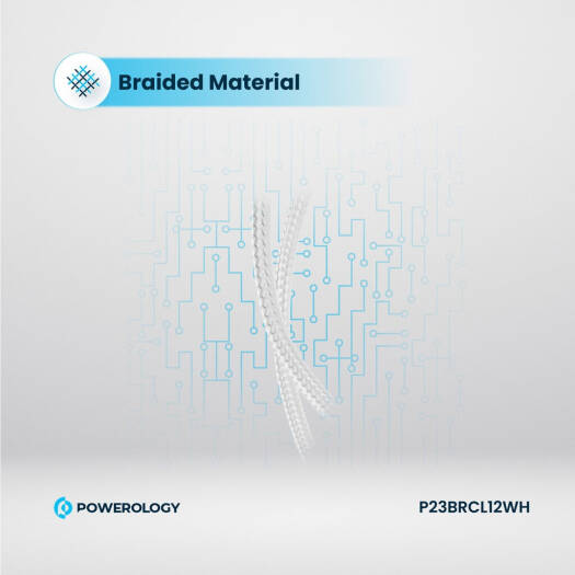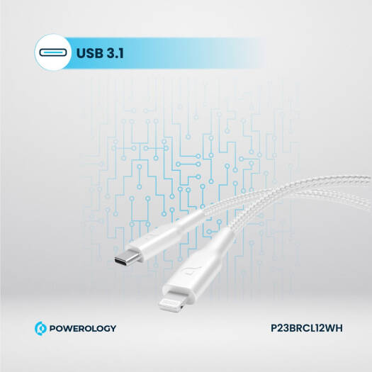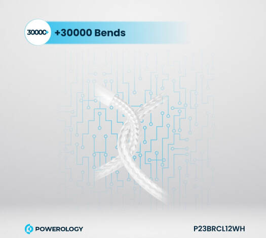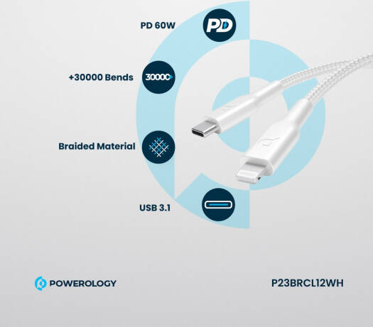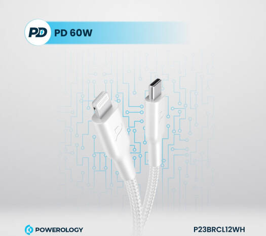 Powerology New Braided Type-C to Lightning Cable, 1.2M Length, PD 60W, 30000+ Bends, Fast Charging, 0 to 60% In 30 Minutes, White | P23BRCL12WH