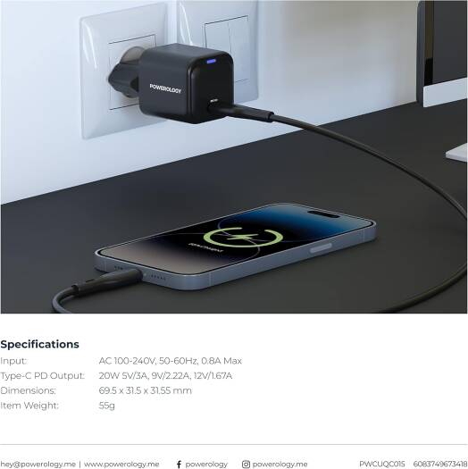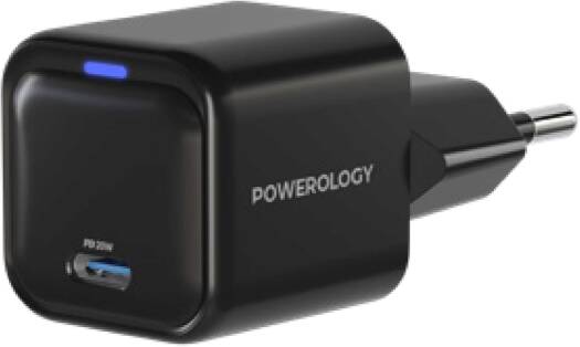 Powerology Ultra-Compact Type-C 20W Gan Power Delivery Charger EU, 2 pin – Adapter with Built-In Safeguards, Fast Charging Compatible with iPhone 15 Pro Max – Black | PWCUQC015