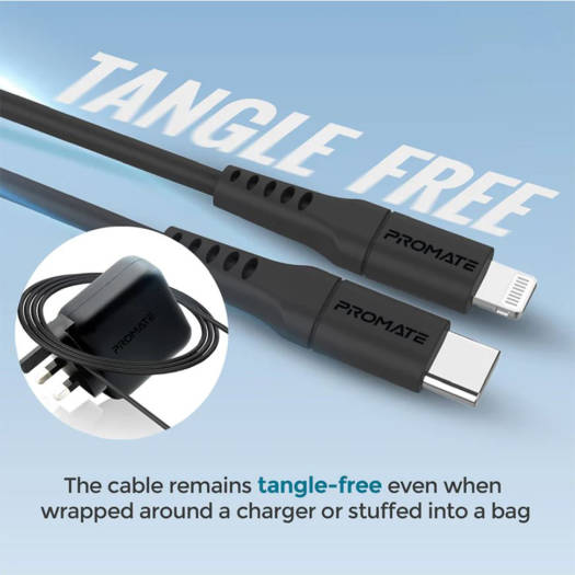 Promate 20W Ultra-Fast USB-C To Lightning Cable, 3x Speed 3A Fast Charging, 480Mbps High Speed Data Transfer, 25000+ Bend Test, Tangle Free, 200cm Length, Black | PowerLink-200