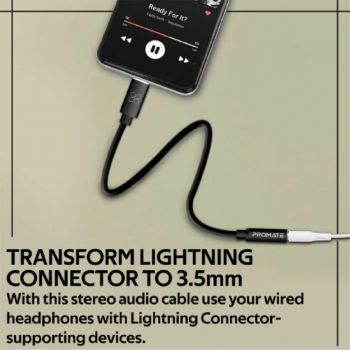 Promate Dynamic Stereo Apple Lightning to 3.5mm AUX Connector, Compatible With All Apple Devices, Black | AUXLINK-I