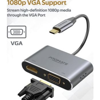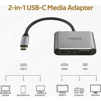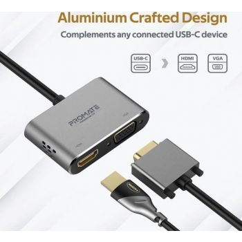 Promate High Definition USB-C Display Adapter, 5V Input Video Signal, USB-C to VGA HDMI Converter, 4K Ultra HD, With 1080 VGA, Dual Screen Display Support, For MacBook Pro/Air, iPad | MediaHub-C2