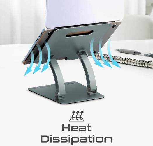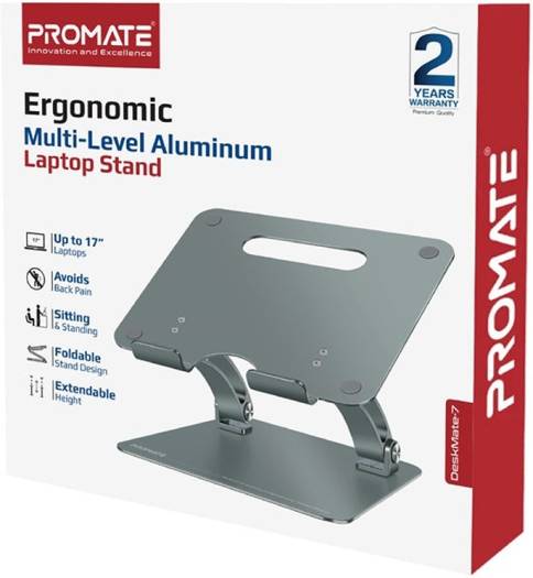 Ergonomic Multi-Level Aluminum Laptop Stand Convenience and ergonomics blended into a sleek lightweight laptop stand, the DeskMate-7 is designed to elevate your laptop for better viewing angles and create a comfortable slanted position for wrists while typing. The aluminum design and forward tilt improves airflow around the laptop and distributes heat away from the laptop, keeping your laptop cooler. This stand offers stability as well as maintains its lightweight form factor, making it highly portable.