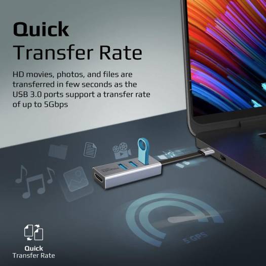 Mirror your USB-C laptop to view your favorite TV shows and movies in an enhanced, high-resolution display on your external monitor. Simply plug and play with no complicated drivers or installation needed. HD movies, photos, and files are transferred in a few seconds as the USB 3.0 ports support a transfer rate of up to 5Gbps. Premium 4-in-1 USB-C to HDMI Adapter: The Promate MediaHub-C3 is a USB-C hub equipped with 3 super-fast syncs and charge USB 3.0 Ports with transfer speeds of 5Gbps and a 4K HDMI @30Hz HDMI port. With this adapter, you can directly stream Full HD 1080p video to HDTV, monitors, or projectors. USB 3.0 Connectivity with 3 Super-Fast Sync and Charge Ports: This multiple port hub turns a single Type-C port into 3 USB 3.0 ports, which keeps you away from the trouble of plugging and unplugging into different adapters. An excellent tool for expanding your compatibility and experiencing sync and charge ports, the MediaHub-C3 is the perfect accessory for your home or office.