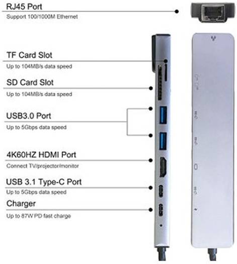 HDMI port supports up to 4K resolutions Supports pass-through charging so you can charge and connect at the same time through a single USB port 5 Gbps bandwidth for fast data transfers between the computer and peripherals While its compact design allows easy mobility and avoids desktop clutter, The compact design allows for easy mobility and avoids desktop clutter, and the aluminum finish matches the majority of recent laptops.