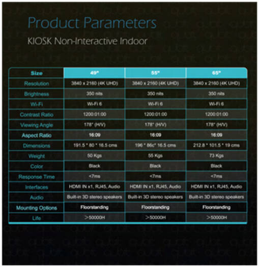 Qbit Kiosk Indoor Non Interactive Signage The Qbit Kiosk Indoor Non-Interactive Signage features a sleek, streamlined design that seamlessly integrates into various interior décors. Its durable yet lightweight structure ensures easy installation and mobility, making it a versatile choice for multiple environments. Equipped with a stunning 49" 4K Ultra HD display, it delivers vibrant colors and balanced brightness for clear content visibility in all indoor lighting conditions. Engineered for long hours of uninterrupted operation, it is ideal for commercial and office use, incorporating advanced components for high efficiency and low energy consumption. Perfect for shopping malls, hotels, hospitals, schools, conference halls, and exhibitions, this signage provides an effective solution for businesses to deliver advertising or informational messages with impact.