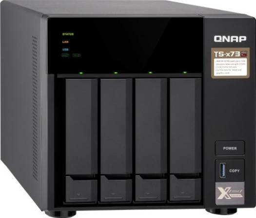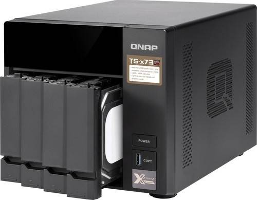 Powered by a 2.1 GHz AMD RX-421ND Quad-Core processor, which can be boosted up to 3.4 GHz, and 8GB of DDR4 RAM, which can be upgraded to 64GB, the TS-473 4-Bay NAS Enclosure from QNAP is a high-performance and energy efficient system that provides two PCIe 3.0 x4 slots that can accommodate M.2 SSD caching/10GbE connectivity, a wireless network card, and an entry-level graphics card to boost performance for 4K video performance. The TS-473 allows you to flexibly deploy a wide range of applications with a more affordable budget. Network connectivity is achieved using four Gigabit Ethernet ports. When two 10GbE cards are installed in the PCIe slots and used simultaneously, read speeds are supported up to 2347 MB/s and write speeds can reach 1764 MB/s. When transferring data with 10GbE and volume encryption, read speeds max out at 2310 MB/s and write speeds go up to 1681 MB/s. This 4-bay enclosure natively supports 3.5" SATA III hard drives, and 2.5" hard drives and SSDs are also supported using included 2.5" drive flat head screws. There are also two M.2 2260/2280 SATA III SSD slots. In order to enhance data transfers, SSD caching is supported on all four drive bays and both M.2 slots. Using the four 5 Gb/s USB 3.0 Type-A ports, this QNAP NAS can be connected to other devices, allowing you to easily transfer large media files and expa