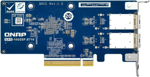 QXG-10G2SF-X710 Enhance your workflow by installing the QXG-10G2SF-X710 2-Port 10G SFP+ PCIe 3.0 Network Adapter Card into your compatible QNAP NAS or desktop computer system. By using separately purchased transceivers, each of the two SFP+ slots can reach up to 10 Gb/s speeds, allowing photographers and videographers to quickly share and transfer footage. This network adapter card fits into an available PCIe 3.0 x8 slot. Both slots may be combined with SMB multichannel or port trunking for 20 Gb/s speeds with compatible devices. The adapter has a low-profile bracket attached with a full-height bracket included alongside a specialized bracket for select QNAP devices. Key Features 2 x 10G SFP+ Slots Up to 20 Gb/s Total Throughput PCIe 3.0 x8 Connection Includes Various Brackets Windows 11 & Linux Support