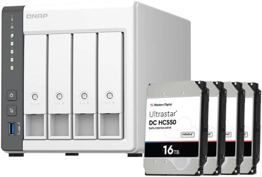 QNAP TS-433 4 Bay 64TB NAS with WD 16TB (4x16TB) Ultrastar HC550 SATA-6Gb/s HDD, 7200RPM / 512MB Cache, ARM 4-core Cortex-A55 2.0GHz, 4 GB RAM, 3Gb/s, 5 Gigabit Ethernet Port