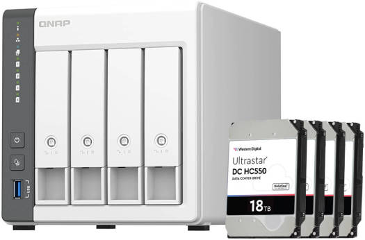 QNAP TS-433 4 Bay 72 TB NAS with WD 18TB (4x18TB) Ultrastar HC550 SATA-6Gb/s HDD, 7200RPM / 512MB Cache, ARM 4-core Cortex-A55 2.0GHz, 4 GB RAM, 3Gb/s, 5 Gigabit Ethernet Port,