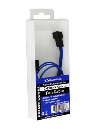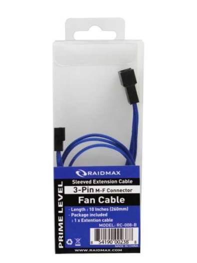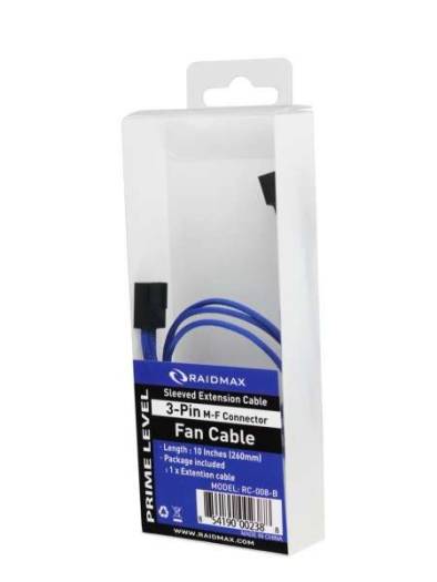 RAIDMAX Sleeved Extension Cables 3-PIN M/F Connector (Fan Cable) BLUE 10-inches | RC-008-Blue