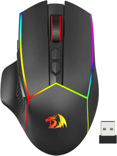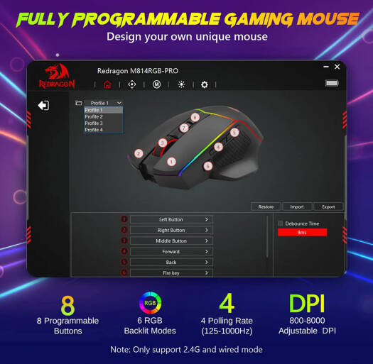 M814RGB-PRO The Redragon M814RGB-PRO Wireless RGB Gaming Mouse is a 8,000 DPI optical gaming mouse with 8 programmable buttons and multiple backlight LED modes. Its 2.4Ghz wireless connectionallows you to game freely without worrying about cables for a better gamingexperience. Geared with 5 adjustable DPI levels (by default500/1000/2000/3000/4000), making it is easy to switch for different game needs. The skin-friendly coating gives you a comfortable grip on the mouse surface, which offers you the most enjoyable experience. The RGB backlighting not only lets you express yourself, but also helps brighten up your gaming rig which in turn lets you stand out.