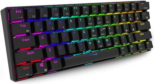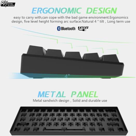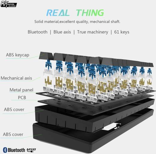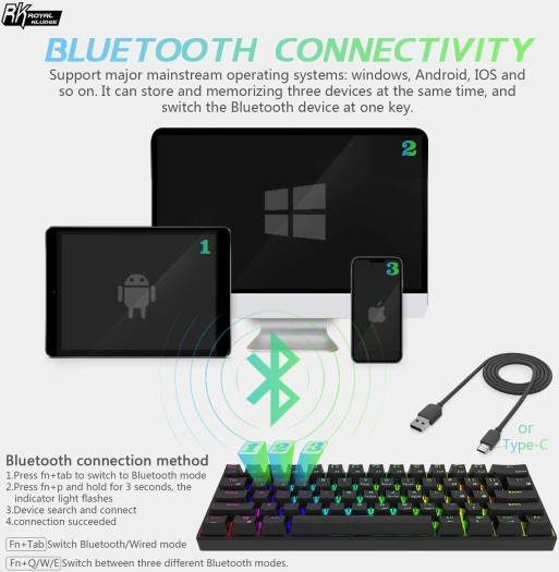 Dual-mode connection: This product can be compatible with Windows 2000/XP/7/8/10/XP/Vista/MAC/Android and IOS systems in wired and Bluetooth modes, and can connect up to three Bluetooth devices for switching at the same time in Bluetooth mode. Gorgeous RGB backlight: 16.8 million color RGB mechanical keyboard, 18 kinds of lighting mode switching cycle, light brightness and speed are adjusted by 5 blocks respectively. Having these modes at night, whether in games or in office, can add some fun to you. Simple and portable: 61-key Compact layout, miniature keyboard. Lightweight, comfortable, light weight, small size, simple shape and portable, suitable for office and family use, in order to save more space. Ergonomic design: RK ROYAL KLUDGE 61 mechanical keyboard ergonomic arc and ladder design, reduce fatigue in use, bring comfortable feeling to customers, minimize fatigue after long-term use, design for games and office workers.