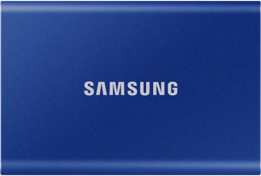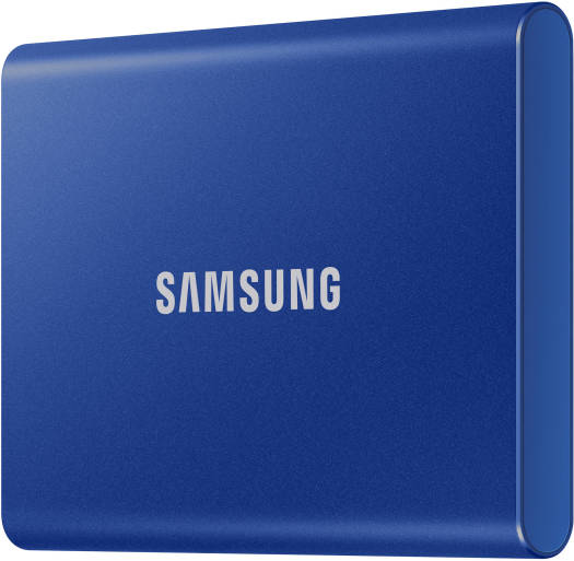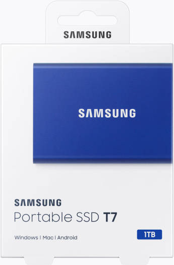 T7 USB 3.2 Portable SSD Compact and Secure Storage for Life On the Go The indigo blue Samsung 1 TB T7 Portable SSD is a compact and secure storage solution that fits in the palm of your hand. Roughly the size of a few stacked credit cards, the T7 is equipped with 256-bit AES encryption and password protection, so users can rest assured knowing their data is safe. Moreover, with PCIe NVMe technology, the T7 offers users quick performance and little downtime with read and write speeds of up to 1050 MB/s and 1000 MB/s respectively. With a USB 3.1 Gen 2 Type-C port, it’s also backwards compatible with USB 3.0 and Type-A devices with an appropriate cable. <