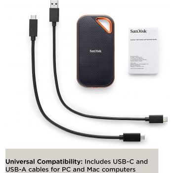 Take pro performance on the go with the 4TB Extreme PRO Portable SSD V2 from SanDisk . Designed for durable performance, this 4TB SSD boasts read and write speeds up to 2000 MB/s via a USB 3.2 Gen 2×2 Type-C connection. Keep files protected with 256-bit AES encryption, while IP55 dust and water resistance, drop-proofing up to 6′, and the aluminum chassis and silicon shell provide physical resilience. A carabiner clip allows for easy attachment to a bag or belt, making this SSD easy to transport. Bus powered, the SanDisk Extreme PRO Portable SSD V2 comes with USB Type-C to C and C to A cables. Key Features 4TB Total Storage Capacity USB 3.2 Gen 2×2 Type-C