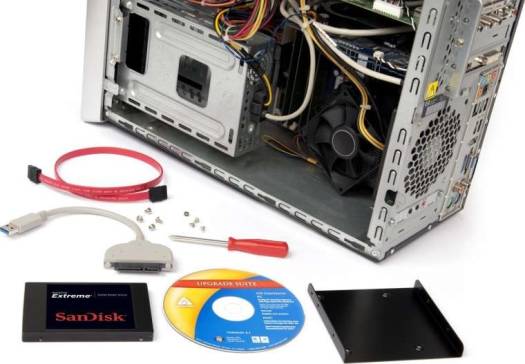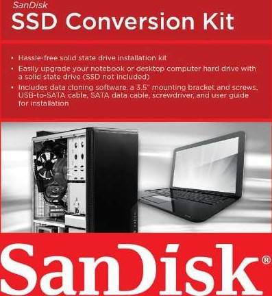MAKE AN EASY TRANSITION TO A SOLID STATE DRIVE Easily upgrade to solid state technology with the SanDisk SSD Conversion Kit. Ideal for do-it-yourselfers or computer enthusiasts, this kit provides the tools you need to replace your computer's hard drive with a new solid state drive (SSD). The kit includes all of the hardware and data-migration software necessary to install your new SSD and transfer data from your old hard drive. INCLUDES ALL NECESSARY HARDWARE FOR SSD INSTALLATION The SanDisk SSD Conversion Kit comes with all the required hardware for installing your SSD (sold separately) in a desktop or laptop PC, including a SATA cable, mounting bracket, screws, and a screwdriver. The mounting bracket can accommodate any 3.5-inch SSD and is designed to hold your drive securely in place. The kit also includes a USB-to-SATA cable which allows you to easily migrate the data from your existing hard drive to your SSD. <div