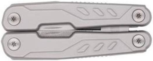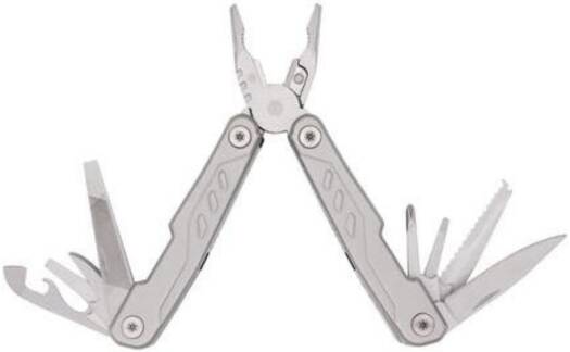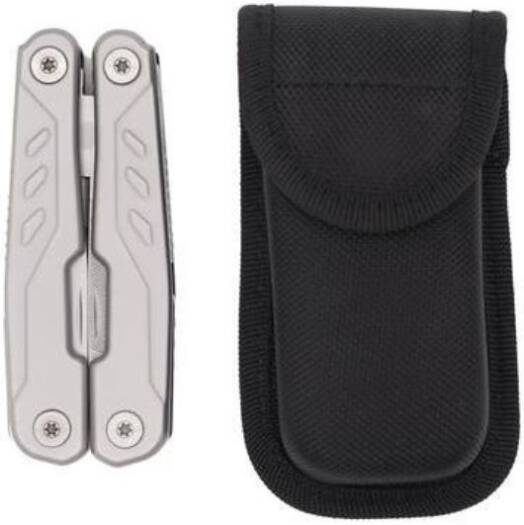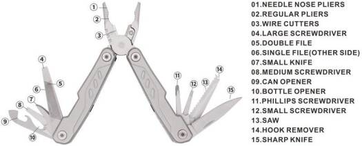 Kitee is a premium stainless steel multi-tool with 15 function tools including: needle nose pliers, regular pliers, wire cutters, large, medium & small screwdrivers, double file, single file, small knife, medium screwdriver, can opener, bottle opener, phillips screwdriver, saw, hook remover, and sharp knife. Packed in a carry pouch.