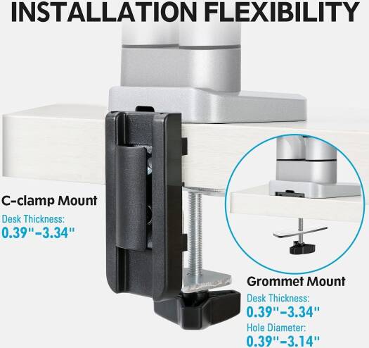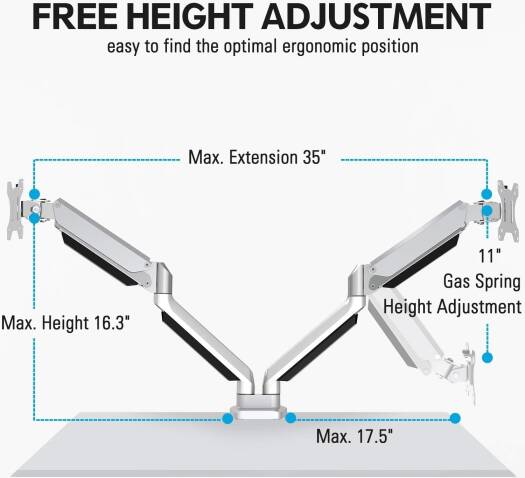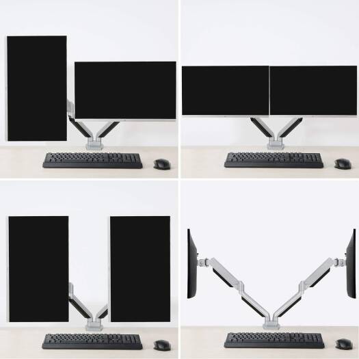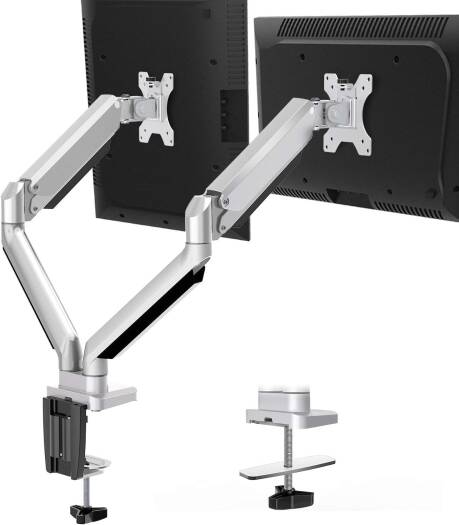 AWH Dual Monitor Desk Mount allows you to boost your productivity by providing a seamless and fully adjustable solution for mounting two screens simultaneously, accommodating monitors from 17 to 32 inches.