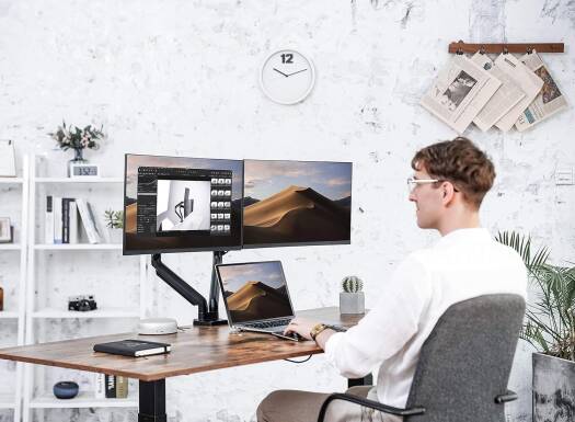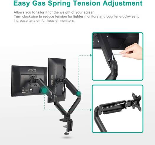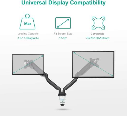 The AWH Dual Monitor Mount Stand is engineered to enhance your workspace efficiency, featuring a fully articulating design with counterbalance gas spring technology for seamless adjustment of two 17-32 inch screens. Achieve optimal viewing comfort by easily adjusting the height of your monitors. The height-adjustable feature ensures a customized setup, reducing strain on your neck and eyes during prolonged computer use.