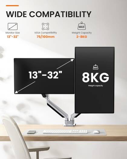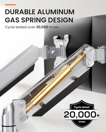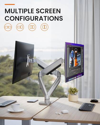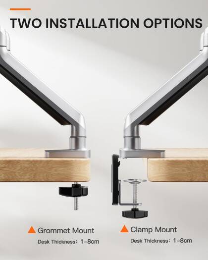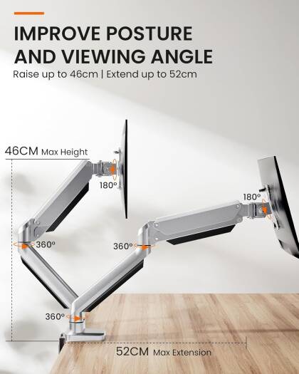 Easy to Adjust VerticalBecause of the gas spring technology, the monitor riser can adjust the height flexible for each arm and easily keep the two monitors at the same height. Max height is up to 41cm and max extension is up to 52cm. It is easier to customize your monitor height than others without gas spring technology products. Adjustment FlexibleThe monitor stand can tilt range 45, swivel range 180, and rotation 360 for obtaining superb viewing angle, you can use this monitor stand to positioning your computer monitor for a suitable place and adjust the monitor angle and height to get it at the healthiest and most comfortable position. Benefits for Health If the monitor too low will cause the neck and spine were aching and particularly if youre tall, you can use this monitor arm to keep a perfect angle between your monitor and your eyes and spine, help you avoid neck pain and eye strain, improve your work efficiency, make working more relaxing and comfortable. Two Installation MoethodsWith the sturdy construction, high-grade material C clamp (fits desk thickness max to 8cm), grommet base (support desk thickness max to 7cm), and VESA plate offers supreme stability, ensures a strong and stable connection with your desk and monitor screen, 2 different installation methods can apply to the different desk. With Cable ManagementMonitor stand with the cable management feature to organize wires and cables fit neatly behind, free up space on d