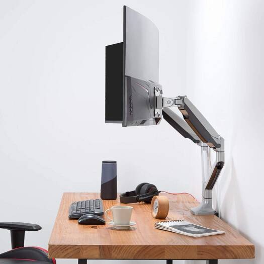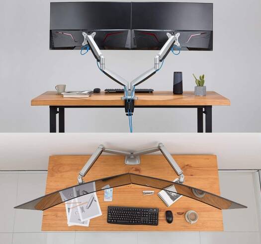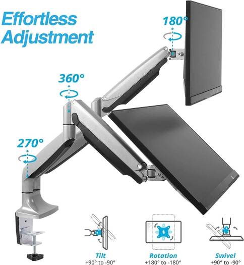 Skill Tech Premium Aluminum Gas Spring Monitor Mounting Arm Dual Heavy Duty Holds 13″ to 32″ Screens, Up to 19.8 lbs Each, VESA 75×75 or 100×100, Dual Desk Mount, Dual Sit/Stand Desk Mount