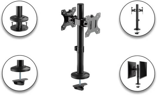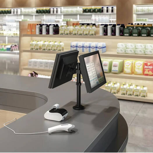 SH DP02 POS STAND – Articulating Pole Mount Single Dual Monitors Mount This Dual Monitors Mount is designed for commercial and retail applications. The mount allows monitors to swivel a full 360° for interaction or information displays, which provides convenient communication access between sales and customers. Each mount features a quick-release VESA plate for easy display installation, wiring and maintenance. Grommet mounting fits most installation needs. Monitor height is vertically adjustable for best monitor placement.