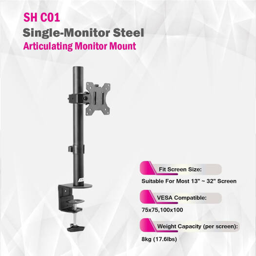 Skill Tech Single-Monitor Steel Articulating Monitor Mount, 13″ – 34″ Fit Screen Size, Max Capacity Per Screen 8kg, Max vesa 100×100, Alloy Steel Material, Matte Black | SH C01