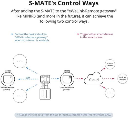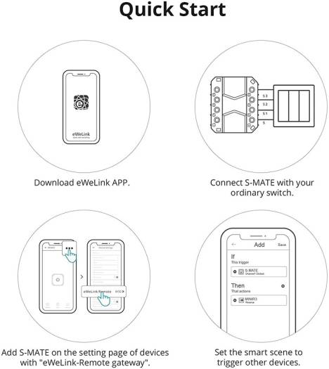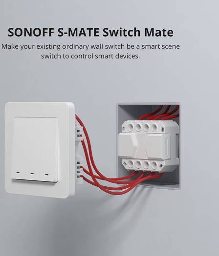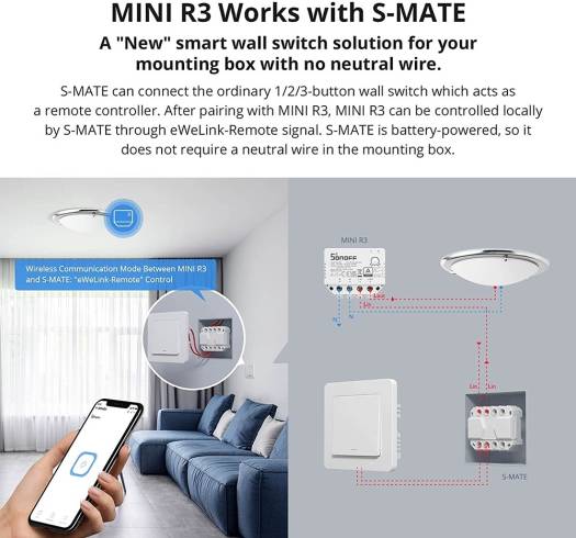 eWeLink-Remote” Control Use it with the MINI R3 or other smart switch with the gateway function of “eWeLink-Remote”, it can achieve “eWeLink-Remote” control. Control Ways Control built-in “eWeLink-Remote gateway” devices when no Internet is available, and it can trigger other smart devices in the smart scene when there is a network connection. Compatible With Switch Types S-MATE is fit for almost any switch type, like, pulse switch, rocker switch, change your existing switch into a smart one. Switch Mate Works with MINI R3 smart switch, M5 smart wall switch and S40/S40 LITE smart plug.