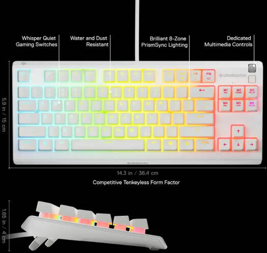 SteelSeries Apex 3 TKL Wired Membrane Gaming Keyboard, 8-Zone RGB Illumination, 24 Keys N-Key Roll Over, Gaming-Grade Anti-Ghosting, English (US) Layout, White | 64819