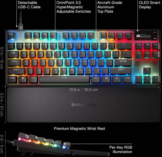 SteelSeries Apex Pro TKL Gen 3 Mechanical Gaming Keyboard, OmniPoint 3.0 Adjustable HyperMagnetic Switches, Double Shot PBT Keycaps, US English Layout, Wired Connectivity, Black | 64740