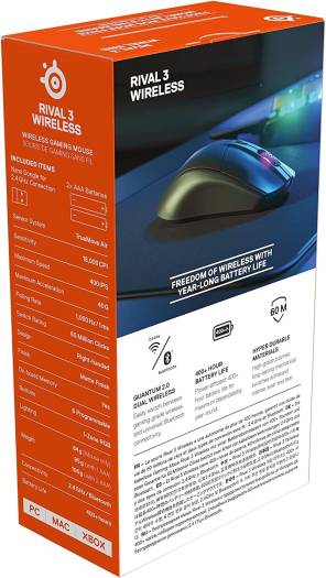 Rival 3 The rival 3 wireless utilizes Quantum 2.0 dual wireless technology to provide ultra-low latency wireless via 2.4GHz and Bluetooth connectivity. It’s optimized for power-efficiency, giving it an industry-leading 400+ hour battery life. A performance-focused gaming sensor, on-board memory, RGB notifications, and more make it ideal for gamers who need a multi-purpose mouse. Hyper durable materials and 60 million click mechanical switches ensure that the rival 3 provides unrivalled performance with maximum versatility. Year-long battery life for over 400+ hours of uninterrupted use with revolutiona