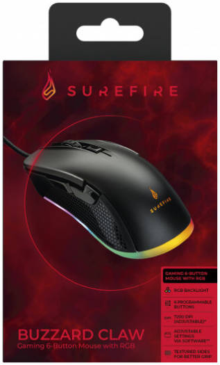 SureFire Buzzard Claw 6-Button Wired Gaming Mouse, 7200 DPI, Up to 1000Hz Polling Rate, 6 Programmable Buttons, 7000 FPS Max Sensor Speed, Full RGB Lighting, 1.8m Cable Length, Black | 48836