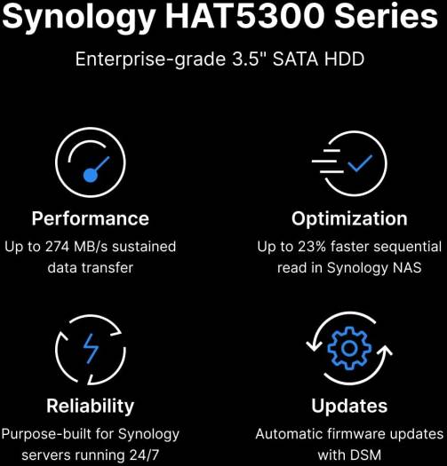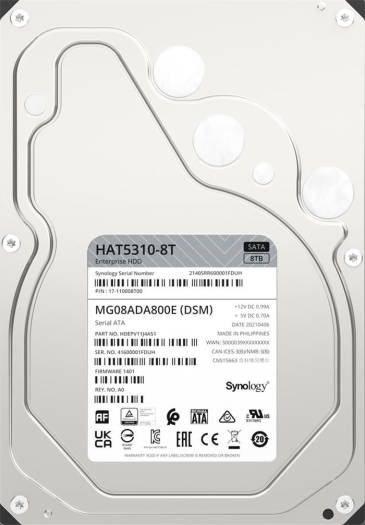 Enterprise Series 3.5″ SATA HDD High-performance, reliable hard drives for Synology systems Designed to tackle demanding, high-volume workloads in 24/7 environments, the 8TB HAT5310 SATA III 3.5″ Internal Enterprise HDD from Synology has been optimized for their storage solutions and enables a high sequential throughput that helps maximize the number of clients a system can sustain. Engineered for improved dependability, the HAT5300 has a Mean Time to Failure (MTTF) rating of 2.5 million hours and a yearly workload rating of 550TB. Also featured is a storage capacity of 8TB, a SATA III 6 Gb/s interface, a 256MB cache, and a rotational speed of 7200 rpm, all of which help to ensure uninterrupted data transfers with sustained speeds of up to 230 MB/s.