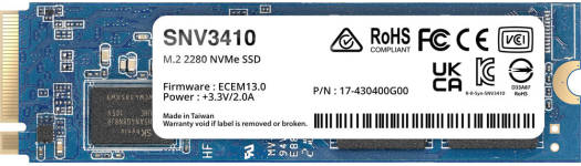 NVMe M.2 2280 SSD Boost the performance of your compatible NAS with the 400GB SNV3410 NVMe M.2 2280 SSD from Synology, which has been tailored for their NAS models with built-in M.2 slots. It can handle tough caching workloads in 24/7 multi-user environments, while its consistent I/O performance boosts system responsiveness and speeds up the handling of frequently accessed data to provide a streamlined storage experience while minimizing service disruptions. Features Designed for Select Synology NAS Models 800GB Storage Capacity M.2 2280 Form Factor PCIe 3.0 x4 Interface Up to 1000 MB/s Sequential Write Speed Up to 3100 MB/s Sequential Read Speed 1.8 Million Hours MTBF Endurance up to 1022 Terabytes Written