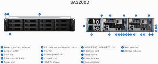 Simplify and centralize your data management infrastructure with the SA3200D 12-Bay NAS Enclosure from Synology, a 2U rackmount server that helps minimize downtime with dual-controller architecture, helping to ensure that operations and core business functions are not severely impacted by a disaster or unplanned incident that take critical systems offline. The hardware redundancy mechanism leverages controllers, power supplies, and fans to help prevent a single point of failure so that your network, file services, and applications are protected. This unit has 12 drive bays, each of which natively supports 3.5″ SAS hard drives, as well as 2.5″ SAS hard drives and SSDs. Should users need to expand the overall capacity of their SA3200D, two mini-SAS ports can each accommodate one RXD1219sas expansion unit. Between the NAS and two expansion units, up to 36 drives are supported. Key Features 12