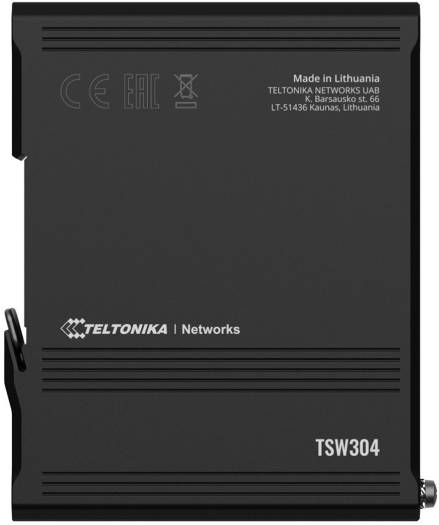TSW304 is Teltonika Networks’ first unmanaged switch with an integrated, built-in DIN rail mount. Equipped with four Gigabit Ethernet ports supporting the IEEE 802.3, IEEE 802.3u, and 802.3az Ethernet standards. Designed with easy installation in mind, the TSW304 features a compact size with a shock-resistant casing to go along with its integrated DIN mount. 10/100/1000 Mbps Ethernet ports for economical, high-bandwidth solutions to provide reliable data throughput. 2-pin industrial power socket and wide range of supported power supply voltages (7-57 VDC and 9-40 VAC). DIN RAIL Built-in, integrated DIN mounting COMPACT 102 x 25 x 81.5 mm GIGABIT ETHERNET 4 x Gigabit Ethernet with speeds of up to 1000 Mbps 7