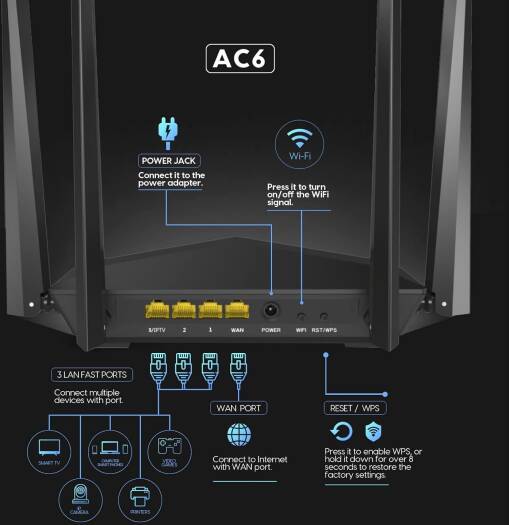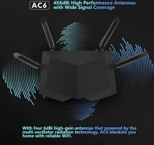 AC6 is a Smart Dual-band WiFi Router with strong signal and stable performance. It supports 5th generation Wi-Fi standard 802.11ac and the concurent dual-band speed is up to 1167Mbps. 900MHz CPU from Broadcom offers fast & stable performance. AC6 has 2x through-wall ability than normal routers with its independent power amplifiers, beamforming+ Intelligent technology and 4x 5dBi HG antennas. You can enjoy lag-free gaming and uninterrupted video streaming anytime anywhere. Additionally, AC6 supports smart power saving technology, App remote management, creates a low-power consumption and smart eco-friendly life for your whole family. Main Features • Fast 11ac speed ups to 1167Mbps, delivering both 867Mbps at 5GHz and 300Mbps at 2.4 GHz concurrently. • Broadcom Chip with 900MHz CPU and 3x processing speed provide better compatibility and superior stability. • High powered amplifiers and external antennas for whole-home coverage. • Beamforming+ technology boosts range for the 802.11ac WiFi devices. • Smart managements of WiFi schedule, LED indicator and powe