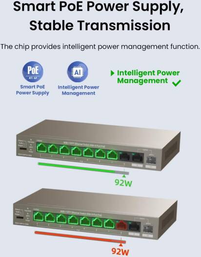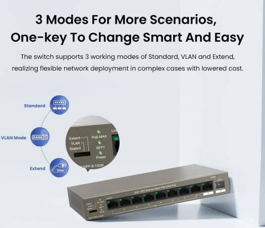 TEG1110PF-8-102W is a 10-port gigabit Ethernet unmanaged PoE switch independently designed by Tenda. It supports IEEE 802.3af/at standards for PoE power supply, capable of transmitting data and supplying power for 8 HD PoE cameras or gigabit APs. The maximum PoE output of a single port is 30 W and the total power consumption of the switch is 102W.Supporting three-mode toggle, TEG1110PF-8-102W is suitable for complex networking deployment and is your ideal choice for video surveillance and gigabit wireless networking in such scenarios as SMEs, residential areas,industrial parks, hotels and schools.