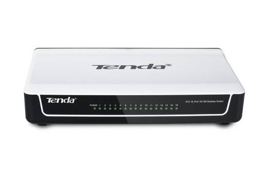 Tenda S16 16-Port 10/100Mbps Switch The Tenda S16 16-Port 10/100Mbps Switch provides simple and ideal solution to expand network for large home, building, leased or rented house and SMB. Connect this 16-port switch to a router and add up to fifteen additional computers or other Ethernet-based devices such as a printer, Network-Attached Storage (NAS), or Internet camera to increase the functionality of your network. Housed in sturdy plastic case with compact size, it is ideal for desktop installation. >> 16 Autosensing 10/100Mbps switched ports with auto MDI/MDI-X crossover detection >> Up to 200Mbps full duplex bandwidth on each port >> Compact size fits into any environment >> Address Learning and Aging, and Data Flow Control for enhanced transmission Space-saving Design The switch is solidly built in small size that is easy to position on any flat surface with limited space.