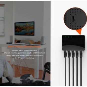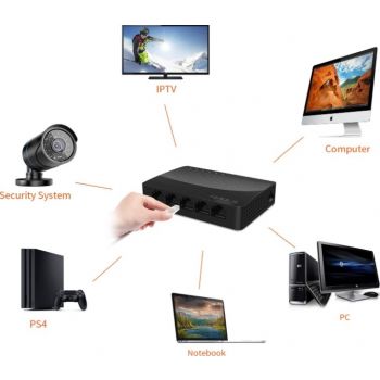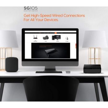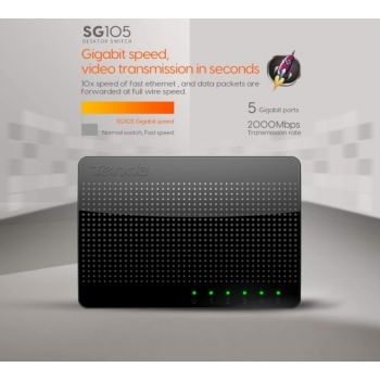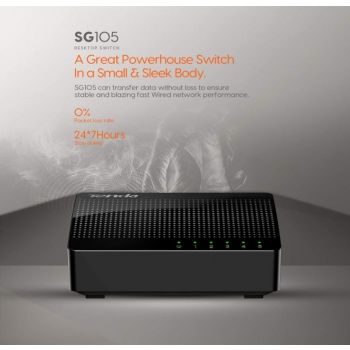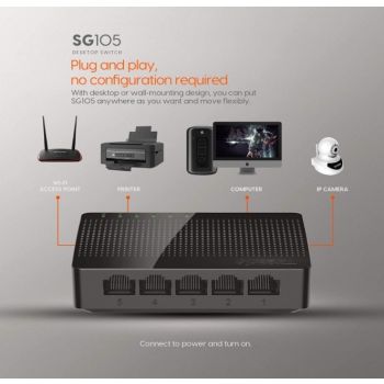 SG105 5-Port Gigabit Desktop Switch What It Does SG105 is a 5-Port Gigabit Desktop SOHO switch. It provides 5 10/100/1000Mbps auto-negotiation ports, which you can use to establish a LAN network, or extend the uplink network. Compared with a 100M switch, it enhances transmission speed up to 10 times, eliminating the bottleneck of cascading bandwidth. It supports desktop installation and wall-mounting. Without configuration, it can be played once plugged. With the stable connectivity and easy-to-use features, it is perfectly fit for the networking of school dormitories, small offices, home offices and Video Surveillance. Main Features 5* 10/100/1000Mbps auto-negotiation