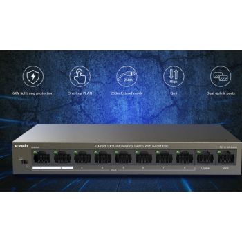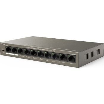 Tenda TEF1110P 10-Port 10/100M Desktop Switch with 8-Port PoE, 6KV Lightning Protection, One-key VLAN, 250m Extend Mode, QoS, Dual Uplink Ports, 1.6 Gbps Capacity | TEF1110P-8-63W