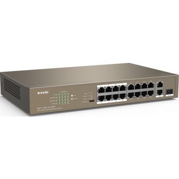 Tenda TEF1118P 16-Port Unmanaged PoE+ Switch: 16FE+2GE/1SFP, 6KV Lightning Protection, 4 Modes, 150W Power, 7.2Gbps, 1.25Mb Buffer | TEF1118P-16-150W