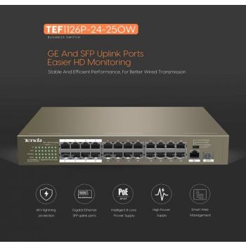 Tenda TEF1126P 24-Port PoE Switch, 8.8 Gbps, 4M Buffer, Rackmount, 135W Power Output | TEF1126P-24-250W