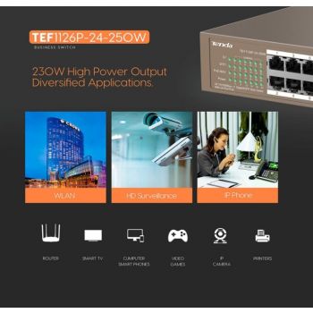 TEF1126P-24-250W not only offers 24 10/100 Mbps Base-TX RJ45 ports but also 1 10/100/1000Base-T RJ45 port and 1 1000 Mbps Base-X SFP port. Ports 1-24 comply with the IEEE 802.3af standard and 802.3at standard and each port can support a maximum PoE power output of 30 W. The switch offers a maximum PoE power output of 135 W and it can supply power when exchanging data with APs, IP cameras, and IP phones through CAT5 cables. It also provides simple management modes such as CCTV, VLAN, and Extend to help reducing cabling costs of IP terminals.