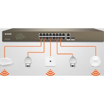 Tenda TEF1218P-16-250W Smart PoE Switch Tenda TEF1218P-16-250W is a smart PoE switch independently designed by Tenda. Featured with 16 IEEE 802.3at/af-compliant RJ45 ports, it supplies a maximum PoE power output of 250 W. The switch can supply power when transmitting data with APs, IP cameras, and IP phones through CAT5 cables. Featured smart management functions, including 250 m long-distance power supply, 802.1Q VLAN, link aggregation, QoS and MAC address binding, minimizes the difficulty and cost in networking deployment. Due to smart web management, engineering is so simple Tenda Gigabit smart PoE switch TEF1218P-16-250W, with intelligent web network management functions, provides a more intuitive and user-friendly interface. It supports 250 meters long-distance power supply, QVLAN, link aggregation, QoS, MAC address binding, etc., which greatly re