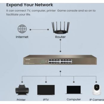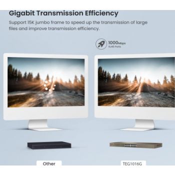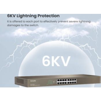 Tenda TEG1016G v8.0 16-Port Gigabit Ethernet Switch Tenda TEG1016G is a 16-port gigabit unmanaged rack switch designed for video surveillance in offices, work groups,and SMEs for easy, economical and high-speed internet purposes. Its full duplex transmission rate can reach up to 2000 Mbps, ensuring the timely transfer of large files as well as smooth streaming videos. The professional integrated lightening protection circuit, the built-in power supply module, and all the 16 ports could withstand 6 kV lightning surge, ensuring the switch to run stably. TEG1016G from AV Mart Australia is your ideal choice for extension, or upgrade to high-speed and stable gigabit wired network. Dedicated for security surveillance and SMEs Stable connection 24/7 16*10/100/1000 Mbps auto-negotiation RJ45 ports, up to 2000 Mbps of full duplex transmission rate, line-speed forwarding by all ports, and large cache capacity ensure the timely transfer of large files and stable streaming video. Excellent lightning protection of ports Professional integrated lightning protection circuit enables all the 16 ports to provide IV-class (6
