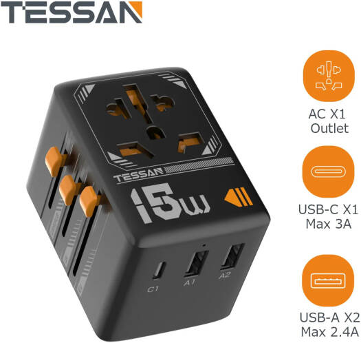 International 15W Travel Adapter Travel effortlessly with the TESSAN International 15W Adapter Plug. This compact and versatile plug features 1 USB-C and 2 USB ports, delivering 15W of fast charging power. Perfect for international travel, stay connected and charged on the go with this convenient travel essential. Specifications Maximum Load 10A Input Voltage 100V-250V AC, 50/60 Hz
